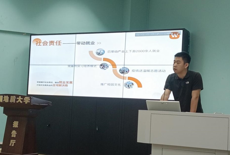 接下来,毕业于我校地空学院的校友王润哲介绍了他创办的武汉瑾裳文化传媒有限公司的主要运营方式,并讲述了他们团队如何转变业务方向、创新与达人的合作模式并推进公司发展的情况,为同学们提供了前沿的创新创业思维方式。他还积极邀请有意愿的同学加盟,承诺帮助同学们运用新媒体矩阵迅速打造个人人设及实现流量变现。