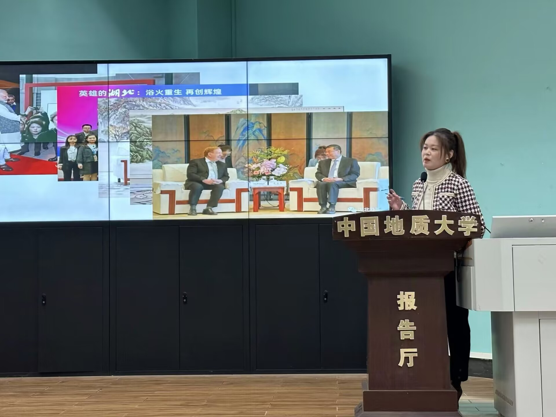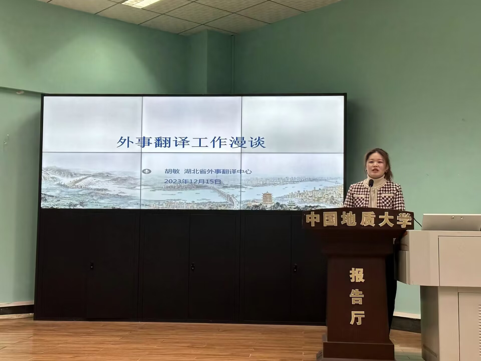 2023年12月15日上午9时00分,开云kaiyun官网“南望今声”外语论坛系列讲座第60期在北一楼120学术报告厅举行。主讲人湖北省外事翻译中心英语翻译胡敏女士,应邀开展了主题为“外事翻译工作漫谈”的精彩讲座。此次讲座由开云kaiyun官网杨红燕副教授主持,八十余名师生参会。