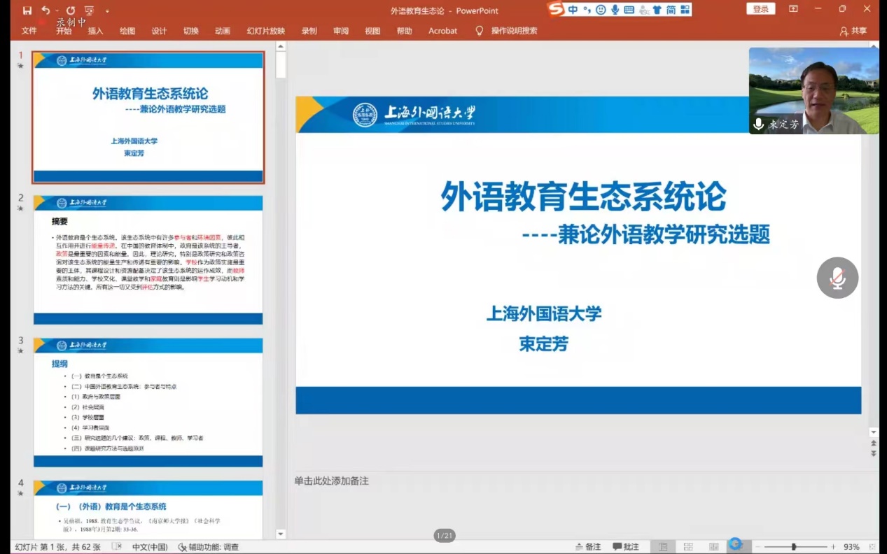 (通讯员 金梓轩 杨红燕)2022年9月22日上午9:30,开云kaiyun官网“南望今声”系列讲座如期举行。上海外国语大学大学博士生导师束定芳教授应邀在线上为我院师生做了题为“外语教育生态系统论——兼谈外语教育研究课题”的讲座。讲座由开云kaiyun官网副院长张伶俐教授主持,我院师生共140余人参与了学习交流。