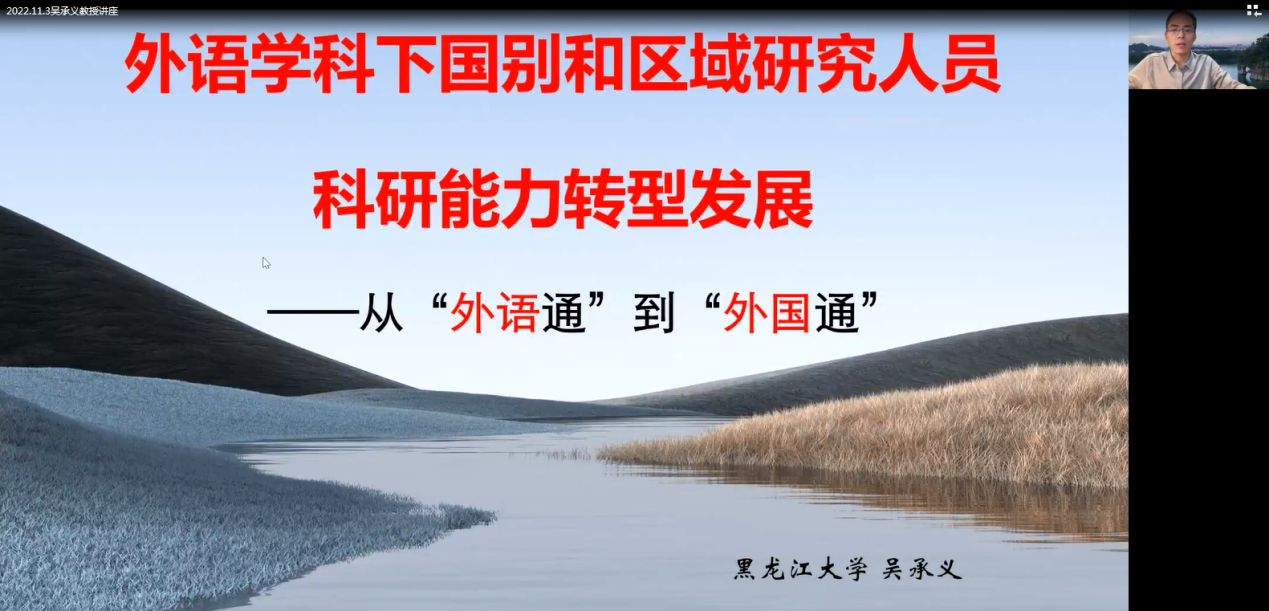(通讯员 王国念)2022年11月3日下午14时30分,作为校庆70周年系列活动之一的“南望今声”外语论坛第40期在线上如期举行。黑龙江大学吴承义教授应邀为我院师生做了题为《外语学科下国别和区域研究人员科研能力转型发展:从“外语通”到“外国通”》的讲座。讲座由我校开云kaiyun官网王国念副教授主持,开云kaiyun官网及其他兄弟高校近200名师生参与学习交流。