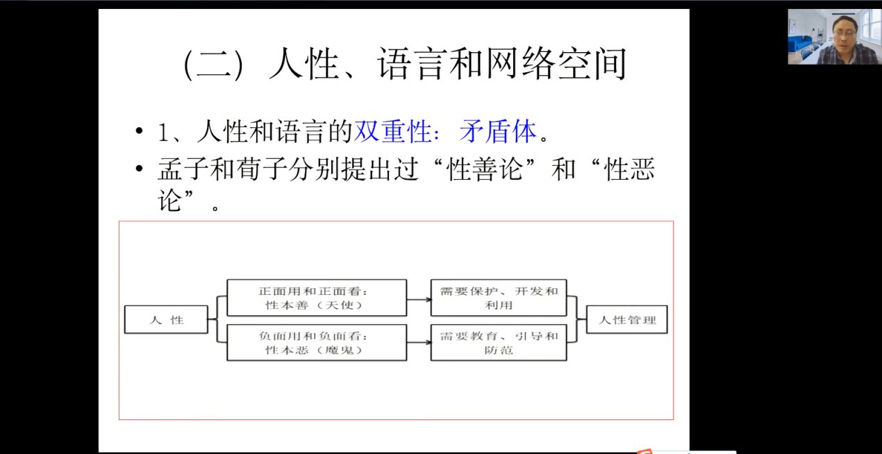张教授首先从个人、单位、国家三个层面来引入网络空间语言安全研究的重要性,提到网络空间本质上就是一个语言世界,语言安全至关重要。张教授通过介绍巴基斯坦的实例阐述语言安全会直接或间接地影响国家安全,因此需要一定的语言安全管理。而就网络空间语言外部安全来说,因其本身存在的特性和网络空间存在的一些不良现象(网民上传假消息、网络语言暴力、语言喷子、网络毒鸡汤和恶搞语言等)使得管理变得十分艰巨。张教授提出管理的宗旨是要让人性善的一面和语言的资源性最大化,而让人性恶的一面和语言的问题性最小化。在管理措施上,张教授认为可以尝试通过国家法律、企业技术和个人修养三方面的共同努力实现对网络空间语言外部安全的有效管理。