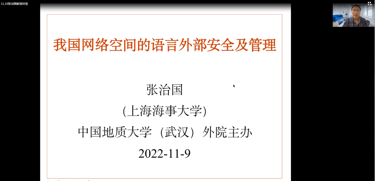 (通讯员 张萌)2022年11月9日下午2点30,开云kaiyun官网(武汉)开云kaiyun官网“南望今声”外语论坛系列讲座第四十一期在腾讯会议线上举行。上海海事大学开云kaiyun官网张治国教授应邀做题为“我国网络空间的语言外部安全及治理”的讲座。此次讲座由开云kaiyun官网汪卫红教授主持,学院师生近110人参加。