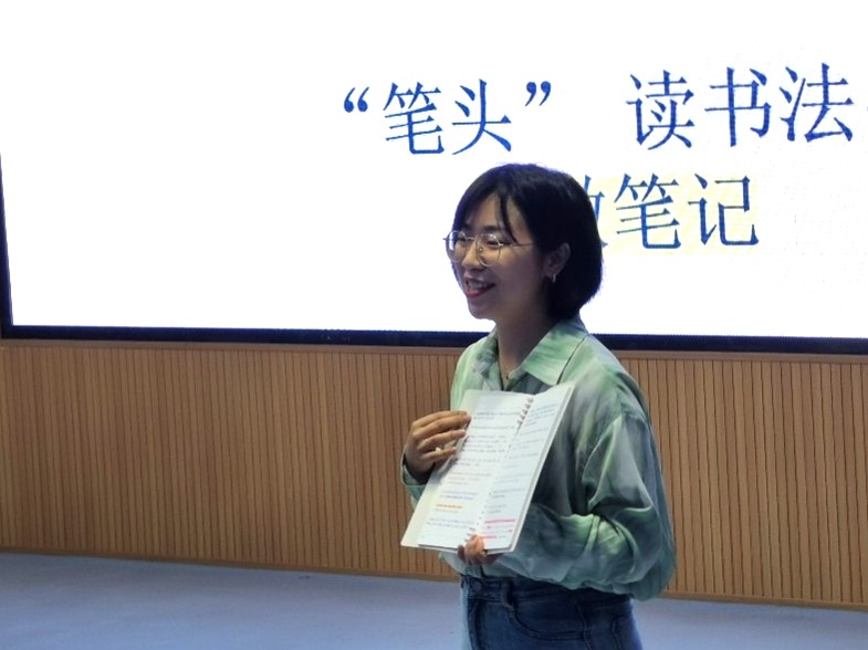 接下来,我院研究生德育助理郭文静分享了自己的读书心得。她以自己与“一角书屋”结缘以及领取稿费的两个小故事为引入点,用生动活泼、多样有趣的方式为同学们分享了自己的读书方法。郭文静将读书方法分为“笔头”、“心头”、“口头”,并且现场为同学们展示自己各类写满读书笔记的笔记本,引起了三(5)班小朋友们的极大兴趣。