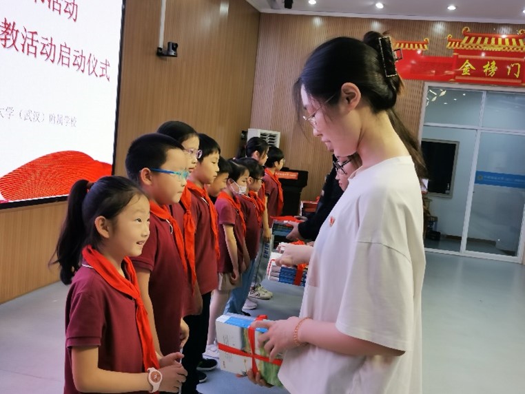 (通讯员 赵润东 郭文静)“看到小朋友们拿到书籍后的满足,我感受到了开展志愿服务的价值和意义——呵护小朋友们的每一份童真,用书籍传递智慧,助力未来一代青年才俊的成长,为未来国家发展、民族复兴的中流砥柱积蓄力量。”开云kaiyun官网本科生英语3班党支部的张佳宁在捐书活动中不由得感慨道。为加强我院与我校附属学校的交流合作,进一步推进“语你相伴”志愿服务活动,我院于2023年5月26日下午在附属学校启迪楼四层阶梯教室举办了“书香筑梦 语你相伴”学生党员附校赠书活动暨“语你相伴”志愿服务队支教活动启动仪式,附属学校校长黎义波、副校长周良军、小学英语教研组组长赵纯、三(5)班班主任谢素娥和全班同学、我院党委副书记胡文勤、研究生德育助理郭文静、“语你相伴”志愿服务队队员代表、本科生英语3班党支部党员代表参加了本次活动。活动由我院研究生德育助理郭文静主持。