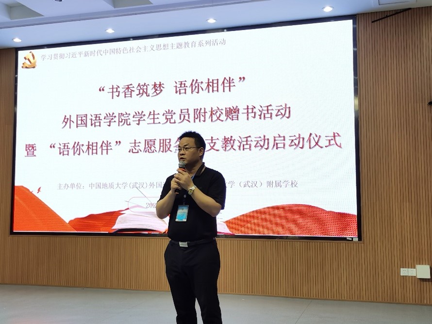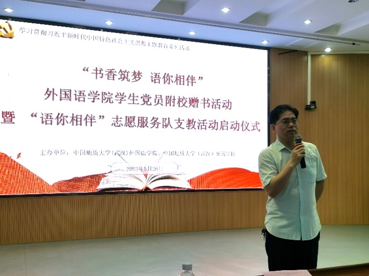 活动最后,我院党委副书记胡文勤讲话。他说,书籍是人类进步的阶梯,希望本次捐书活动能激发附校同学们的阅读兴趣,与书籍相伴,以读书为荣,徜徉书海汲取智慧,追逐梦想茁壮成长;也祝愿我院“语你相伴”志愿服务队能够在今后的支教活动中坚定理想信念,发扬志愿精神,将孩子们领进知识的汪洋,帮助他们开拓国际视野,领略不同国家语言和文化的独特魅力。