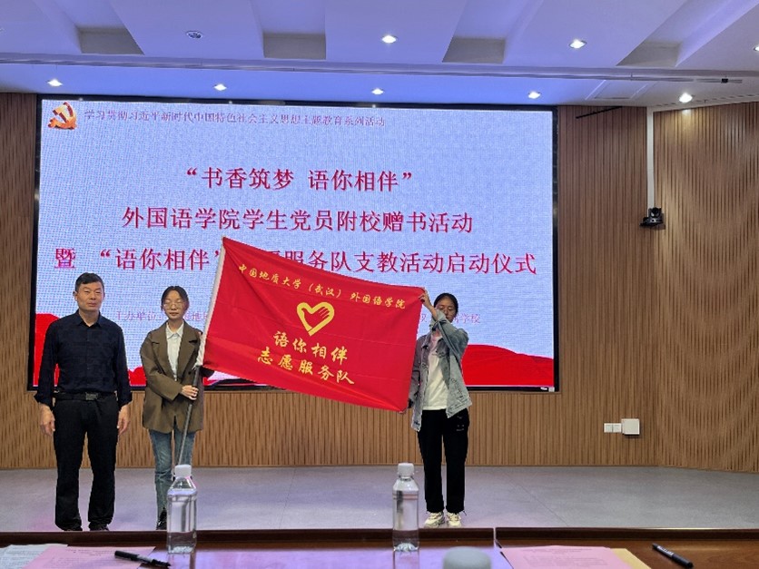 紧接着,附属学校校长黎义波为我院“语你相伴”志愿服务队授旗,这标志着附属学校对志愿服务队工作的认可与接纳,双方将会携手呵护小学生们的成长。