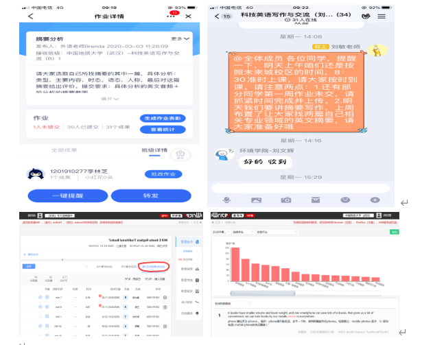 经过热烈讨论,最终确定研究生科技英语写作与交流课程教学采取网上教学+自主学习+网上布置作业和答疑的模式。网上教学通过“雨课堂”、“超星尔雅”、“超星学习通”、“微助教”、“课堂派”等网络教学平台进行;自主网上学习内容包括与课程相关的音频、视频、文本、PPT等资料,由老师向学生发布,也可以由教师推荐相关MOOC课程;网上作业通过Iwrite“爱写作”英语写作和评阅系统进行。